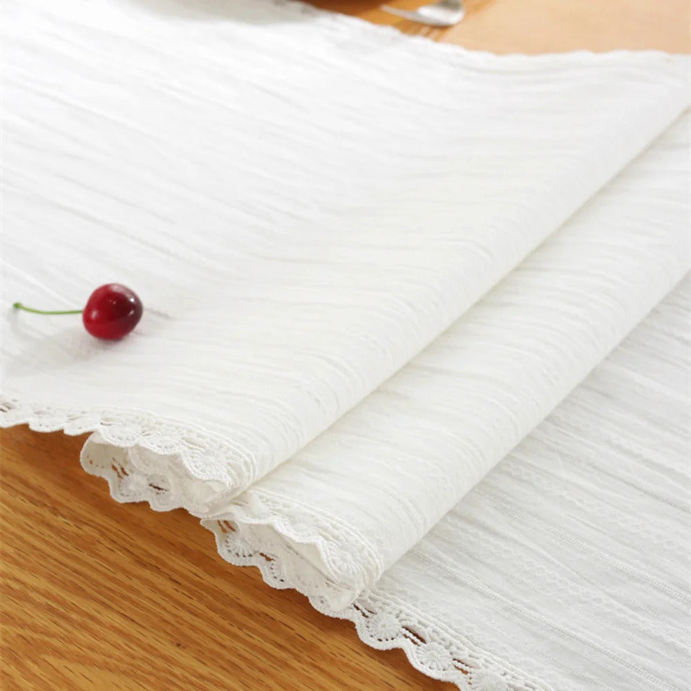 Découvrez l'élégance classique de notre chemin de table blanc élégant, sublimé par un effet dentelle délicat tout autour. Ce chemin de table blanc, fabriqué en polyester et coton, allie beauté intemporelle et robustesse. Son design raffiné et ses finitions en forme de triangle aux extrémités apportent une touche d'élégance sophistiquée.