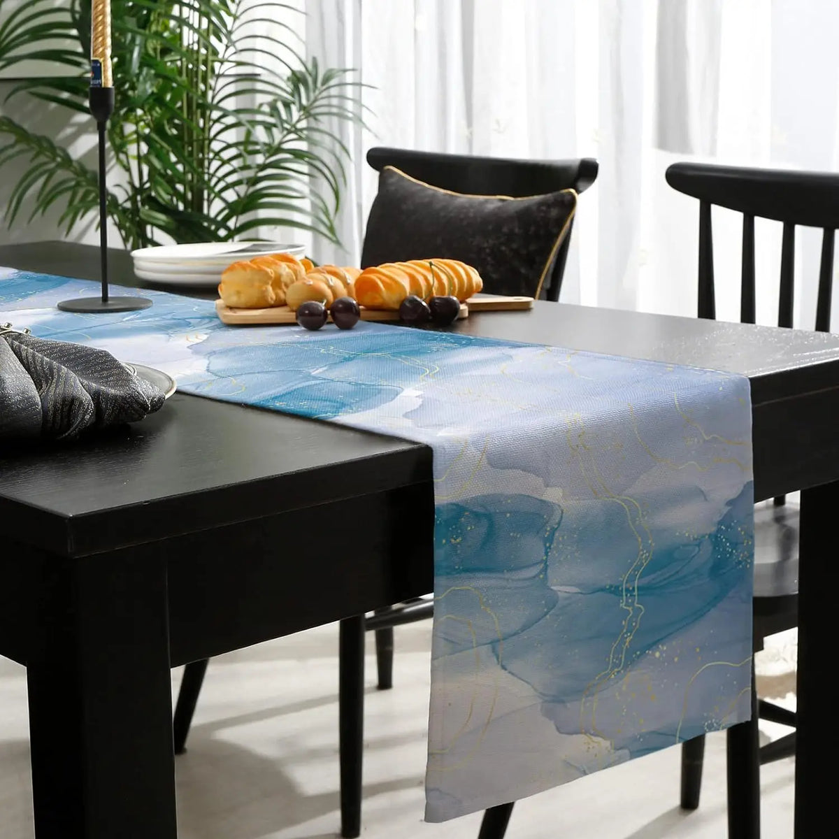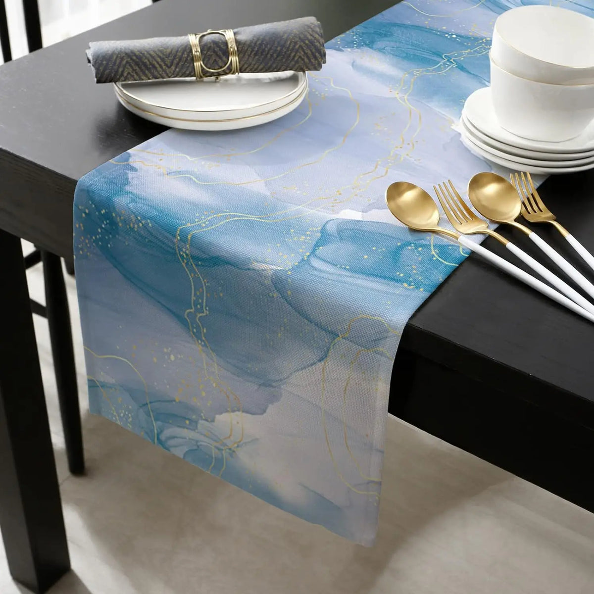 Notre chemin de table bleu design effet marbre est idéal pour transformer vos repas en un moment exceptionnel. Ce chemin de table bleu en lin haut de gamme combine un design effet marbre aux nuances bleutées et dorées, créant un contraste captivant.