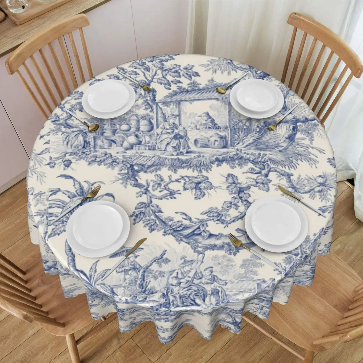 donnez vie à l’art de recevoir avec cette nappe ronde motif toile de Jouy, inspirée du style français classique. Son imprimé délicat en bleu sur fond crème évoque les scènes champêtres et bucoliques d'autrefois, pour un rendu à la fois authentique et raffiné.