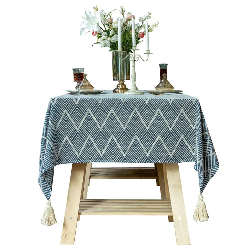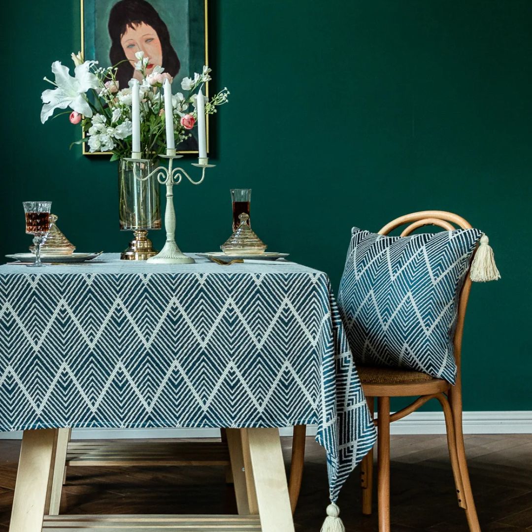Cette nappe de table rectangulaire brodée, en bleu, allie polyester et coton pour une touche de modernité et de style. Les motifs géométriques triangulaires ajoutent une élégance discrète, transformant chaque repas en une occasion spéciale. Cette nappe rectangulaire est parfaite pour rafraîchir votre salle à manger.